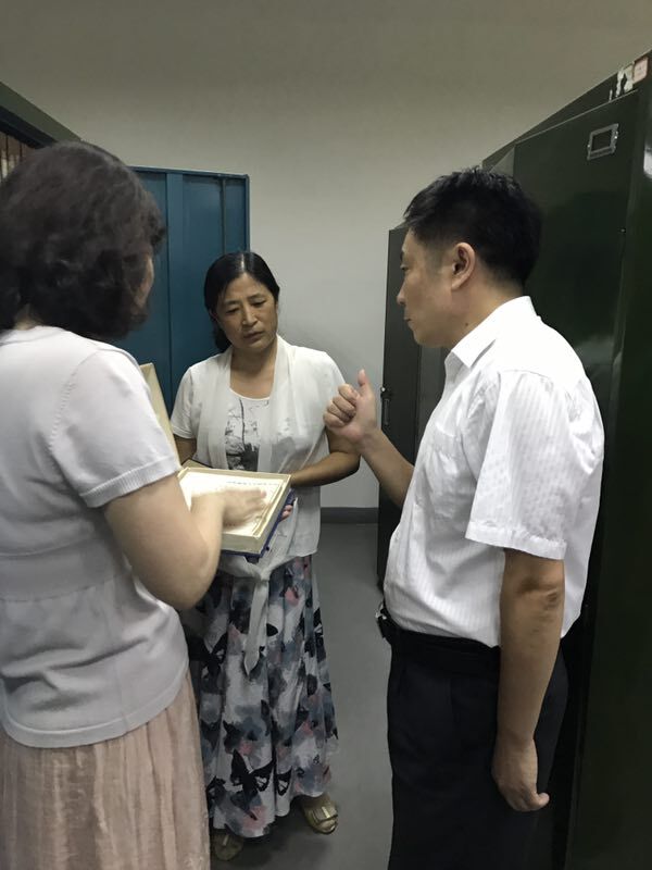 在档案馆库房,万光侠副校长认真听取了张颖馆长关于我校建校以来教学、文书、基建、财务等各类档案的整理保管情况及库房整体布局安排的汇报。万光侠充分肯定了档案馆取得的工作成绩,高度赞扬了全体工作人员的敬业精神。